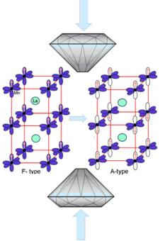 | The structure models for F-type and A-type magnetic ordering in manganite in response to pressure. The arrows inside orbitals indicate the spin direction of d electrons. |