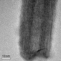 | Nanotubes of tin disulfide were fabricated from SnS2 nanoflakes by the vapor-liquid-solid process using bismuth nanodroplets as a catalyst. The SnS2 reagent in the gas phase preferentially adsorbs onto the bismuth particles; upon cooling, nucleation and growth of SnS2 nanotubes occurs (see HRTEM image). Annealing the nanotubes results in the formation of SnS2/SnS superlattices. |