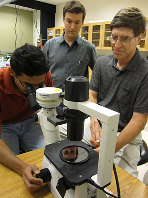 | Ted Boscia/College of Agriculture and Life Sciences From left, Vinay Pagay, Abraham Stroock and Alan Lakso examine a silicon wafer that will be used to build microsensors to monitor water stress in grapevines. |