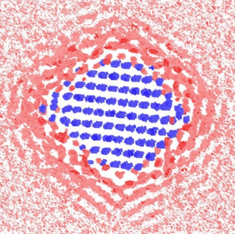 | Why nanosized minerals do what they do: This computer simulation reveals the cross section of the water density around a 2.7 nanometer faceted particle. The blue indicates an iron site, pink indicates the area with low water density, and red indicates the area with high water density. |