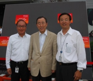 Ban Ki-moon, Secretary-General of the United Nations (center) stands in front of the world's largest thin film solar panel (5.7m2) manufactured by Applied Materials' SunFab production line during a visit to the company's SunFab Solar Module Reliability Testing facility on Saturday. Mr. Ban toured Applied Materials' state-of-the-art solar testing facility in Xi'an, China and met with executives including, Barry Quan the president of Applied Materials China Holding Company (left) and Gang Zou the general manager of Applied Materials Xi'an (right), to discuss the company's leadership in energy efficiency technologies that can help tackle climate change and help China accelerate its emission goals.