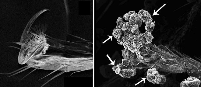 | Nanotoxicity Microscopy shows a clean foot and leg of a fruit fly (left), and a foot and leg covered with carbon nanostructures (arrows). Adhering nanostructures may have impeded movement, respiration and vision in adult flies but did not appear toxic to fly larvae that ingested it. |