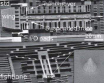 | XSEM overview of IMEC’s standard and fishbone cantilever designs with suspended Pt trace and sharp tips. |
