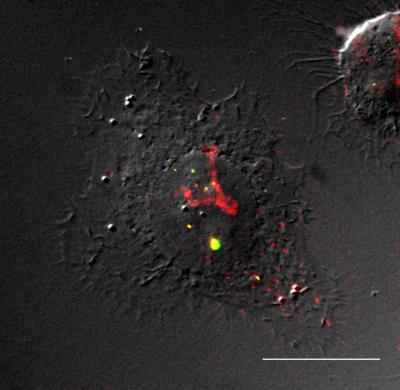 | Researchers at Virginia Tech and at the University of Cincinnati designed novel polymeric beacons capable of delivering plasmid DNA into mammalian cells. This image shows a deconvoluted micrograph of a HeLa cell transfected with DNA-polymer beacon complexes. The DNA is labeled with fluorescein isothiocyanate and appears green in the image. Eu3+ luminescence from the polymeric beacon appears red. Yellow pixels can be qualitatively used to visualize regions of co-localization of DNA and polymer beacon. The DNA and polymer beacon signals are overlaid with the DIC image to show contrast and morphology of the cell (scale bar = 20 micrometers).