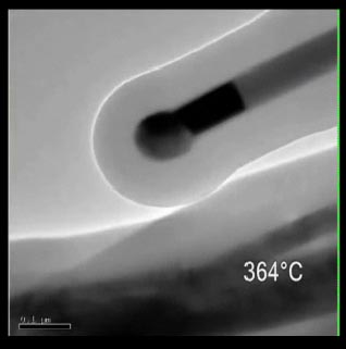 The researchers heated the test tube and watched as the gold melted at the end of the nanowire, much like any solid crystal heated above its melting temperature in a glass test tube.