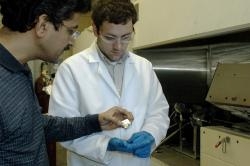 | Dr. Apparao Rao and graduate student Jason Reppert assess the outcome of a nanotube synthesis procedure. image by: Clemson University |