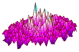 | Colorized simulation of what happens to 1100 carbon atoms in a ‘flat’ sheet of graphene about 20 microseconds after the central atom is moved slightly upwards. Darker violet colors indicate atoms that have dropped below their original position, whereas the lighter green colors show where atoms have risen. Credit: V.K. Tewary/NIST |