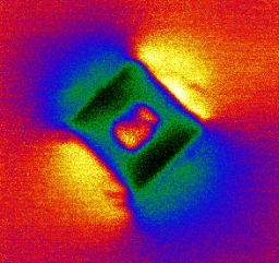 | Polarized light microscopy image of a square microparticle in liquid crystal |