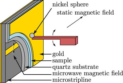 | A schematic of John Marohn's scanned-probe electron spin resonance experiments, with the oscillating cantilever in the middle and the nickel tip that was attached by hand. Eric Moore |