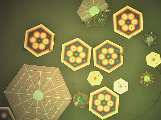 | Representative thin crystalline-silicon photovoltaic cells – these are from 14 to 20 micrometers thick and 0.25 to 1 millimeter across. (Image by Murat Okandan) |