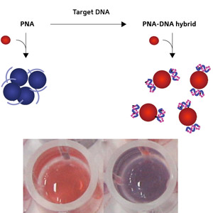 The researchers used gold and silver nanoparticles that have a coating of negatively charged molecules. These charges repel one another, preventing the nanoparticles from aggregating in solution. They then added peptide nucleic acid (PNA) probes to the solution, which bound to the negative surfaces, shielding the charge and allowing the nanoparticles to agglomerate. The solution with gold nanoparticles changed from bright red to dark purple.