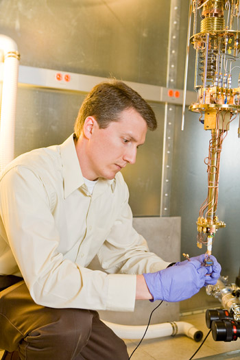 | Jason Petta, an assistant professor of physics, has found a way to alter the property of a lone electron without disturbing the trillions of electrons in its immediate surroundings. Such a feat is an important step toward developing future types of quantum computers. (Photos: Brian Wilson) |