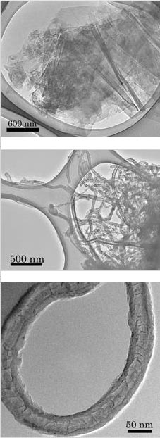The structure of the carbon nanotubes produced in these experiments was determined by Yuki Kimura, a materials scientist at Tohoku University, Japan, who examined the samples under a powerful transmission electron microscope. He saw particles on which the original smooth graphite gradually morphed into an unstructured region and finally to an area rich in tangled hair-like masses. A closer look with an even more powerful microscope showed that these tendrils were in fact cup-stacked carbon nanotubes, which resemble a stack of Styrofoam cups with the bottoms cut out.