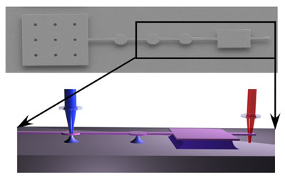 A laser beam, switched on at the far end from the cantilever, travels down the device and causes the oscillator to wobble. The frequency is then measured by shining another laser on the oscillator and noting patterns in the reflected light.