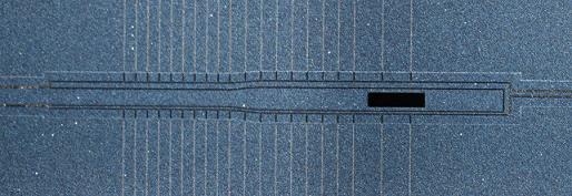 | Optical microscope image of an ion trap designed at GTRI. The dark rectangle is the loading slot that calcium atoms stream through before they are hit with a laser and trapped. Credit: Charlie Doret |