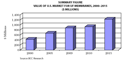 According to a new technical market research report, ULTRAFILTRATION MEMBRANES: TECHNOLOGIES AND THE U.S. MARKET (MST044C) from BCC Research (www.bccresearch.com), the value of the U.S. market for ultrafiltration membranes is an estimated $932 million in 2010, but is expected to increase to more than $1.2 billion in 2015, for a 5-year compound annual growth rate (CAGR) of 5.7%.