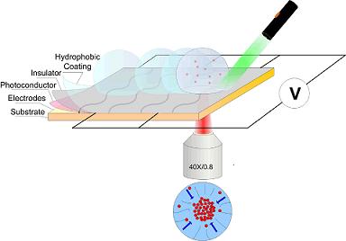 Critical to the technology are electrodes made of indium tin oxide, a transparent and electrically conductive material commonly used in consumer electronics for touch-screen displays. Liquid drops are positioned on the electrodes, and the infrared laser heats up both the electrodes and the droplets. Then electric fields in the electrodes cause the heated liquid to produce a "microfluidic vortex" of circulating liquid. This vortex enables researchers to position the particles in the circulating liquid by moving the infrared laser. The particles accumulate only where the laser is shined.