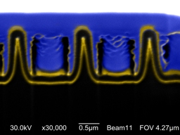 | Boston College researchers report their ‘nanocoax’ technology can support a highly efficient thin film solar cell. This image shows a cross section of an array of nanocoax structures, which prove to be thick enough to aborb a sufficient amount of light, yet thin enough to extract current with increased efficiency, the researchers report in the journal Physica Status Solidi. |