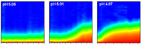 | Successive test runs at NIST show how clumping of typical nanoparticles in a solution depends on changes in acidity. Time after acidity jump is shown on the horizontal axis, while the vertical axis is a measure of the size of the nanoparticle aggregates. As pH goes down (and acidity up), both rate of aggregation and size of clumps of nanoparticles goes up. Credit: R. Murphy/NIST |