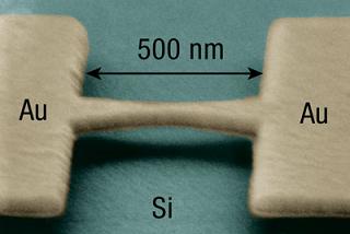 | A scanning electron micrograph of a gold bridge suspended 40 nanometers above a silicon substrate. In the experiment, the bridge is severed in the middle, a single molecule is suspended across the gap, and the substrate is bent to stretch the molecule while simultaneously measuring the electron current through the molecule. Credit: Joshua Parks |