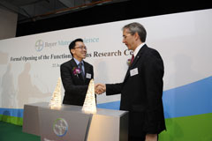 | Mr. Patrick Thomas, CEO of Bayer MaterialScience, and Dr. Beh Swan Gin, Managing Director of the Singapore Economic Development Board, leading the official opening of the new Functional Films Centre in Singapore |