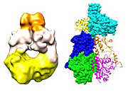 | Left: 3-D phytochrome map; Right: Fit-together fragments forming two sister units (one shown as ribbon, the other in space-filling format), revealing twisted structure. |