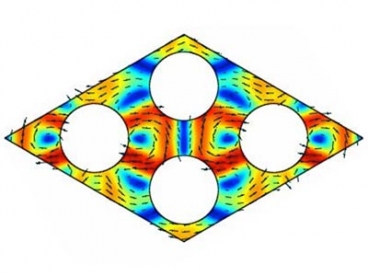 | A computer simulation shows phonons, depicted as color variations, traveling through a crystal lattice. The lattice in this case is broken up by round rods whose spacing has been chosen to block the passage of phonons of certain wavelengths. |