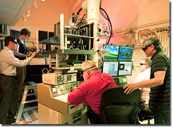 | Working with the dynamic transmission electron microscope (DTEM). From left: Bryan Reed, Melissa Santala, William DeHope, Thomas LaGrange, Joseph McKeown. Photo by Jacqueline McBride/LLNL |