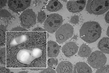 | Images of Ramos cells targeted with nanoparticles. Particles carrying human transferrin (white dots, above image and close-up insert) were able to zero in on, attach to and enter cells (grey spheres). |