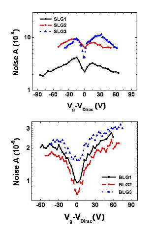 "In this work, we present the four-probe low frequency noise characteristics in single- and bi-layer graphene samples, using a back-gated device structure that helps simplify the physics in understanding the interactions between the graphene and the silica substrate," says Zhang. "For single-layer graphene we found that the noise was reduced either close to or far away from the lowest electron density of states, sometimes referred to as the Dirac point for graphene, forming an M-shaped pattern. For the bi-layer graphene, we found a similar noise reduction near the Dirac point but an increase away from that point, forming a V-shaped pattern. The noise data near the Dirac point correlated to spatial-charge inhomogeneity."
