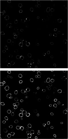 | Yeast cells labeled with fluoromodules (top) glow brighter (bottom) when researchers incorporate dyedrons into the fluoromodule complex. The fluoromodules are expressed on the cells' surface. |