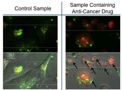 | Images of nanoparticles (green) taken up by breast cancer cells. In the control sample (left), the magnetic field is not turned on. For the sample exposed to the magnetic field (right), an anticancer drug doxorubicin (red) is released into the cells, and the cells are killed. |