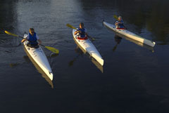 | Some new kayak prototypes have now been coated with an epoxy gelcoat modified with Baytubes® that has been developed by Norwegian research company Re-Turn AS, based in Gamle Fredrikstad. Thanks to the carbon nanotubes from Bayer MaterialScience the outer skin of the kayak is more abrasion-resistant. They also ensure that cracks appear less frequently over long-term use. The picture shows Stein Dietrichson, managing director of Re-Turn, Paal Francis Hansen, chairman of the board, and a trainee during a trial run (from right to left). |