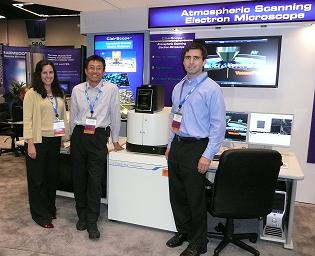 | JEOL ClairScope received MT-10 Award at Microscopy & Microanalysis conference in Portland, Oregon. JEOL personnel are Donna Guarrera (JEOL USA, Peabody, Mass.), Product Manager, and Hidetoshi Nishiyama (JEOL Ltd., Akishima, Japan), Co-Developer of the JEOL ClairScope Atmospheric Scanning Electron Microscope, and Doug Gembala (JEOL USA Service Engineer). |