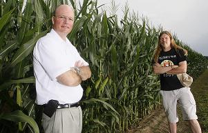 | Marshall Porterfield, at left, and Angus Murphy will be able to better understand how the plant hormone auxin regulates plant root growth and seedling establishment with a biosensor developed at Purdue University. (Purdue Agricultural Communication photo/Tom Campbell) |