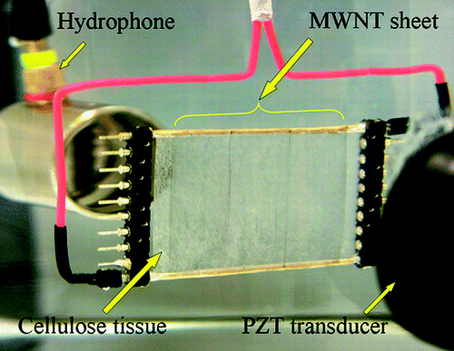 Ali Aliev and colleagues explain that thin films of nanotubes can generate sound waves via a thermoacoustic effect. Every time that an electrical pulse passes through the microscopic layer of carbon tubes, the air around them heats up and creates a sound wave. Chinese scientists first discovered that effect in 2008, and applied it in building flexible speakers. In a remarkable demonstration, which made its way onto YouTube, the Chinese nanoscientists stuck a sheet of nanotubes onto the side of a flag, and attached it to an mp3 player. They used the nanotube-coated flag to play a song while it flapped in the breeze. But they did not test its ability to operate under water.