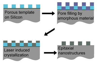 Wiesner's team created a template with hexagonal pores on a silicon single-crystal substrate and deposited films of amorphous silicon or nickel silicide over it. In collaboration with Mike Thompson, associate professor of materials science and engineering, they then heated the silicon surface with very short (nanosecond) laser pulses. This melts the newly deposited layer and the top few microns (millionths of a meter) of the silicon substrate. After only a few tens of nanoseconds the molten silicon recrystallizes with the single crystal silicon substrate acting as a seed crystal to trigger crystallization in the deposited material above it, causing that crystal to line up epitaxially with the seed.