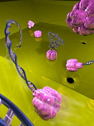 | Artistic rendering of the formation of hybrid pores by the directed insertion of the biological protein pore alpha hemolysin (pink) into solid-state nanopores (holes in the green bottom layer). An applied electric field drives a double-stranded DNA molecule (blue, left) into the hole, which subsequently drags the pink hemolysin protein into position. Once assembled, these hybrid nanopores can be used to pull single-strand DNA (blue, center) through, for analysis and sequencing. Image courtesy Cees Dekker lab TU Delft / Tremani |