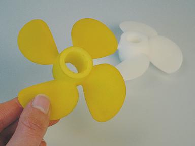 | This propeller was dyed yellow in only five minutes at 90 degrees Celsius and 200 bar. At this pressure, the yellow dye powder dissolved in the CO2 which transferred it into the plastic. (© Fraunhofer UMSICHT) |