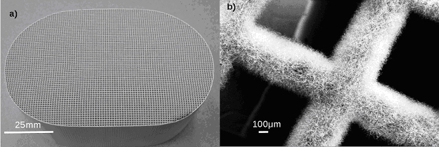 | Figure 1: a) SEM cross section image of Nanospring coated cordierite b) SEM image of the Nanospring coated cordierite wall. |