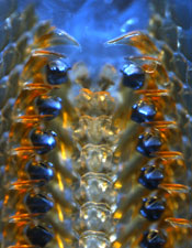 | The black teeth of an Eastern beaded chiton, a sea mollusk, are used for scraping algae from rocks. They are capped with one of the hardest biominerals known, a nanocomposite of magnetite and chitin-based fibers. |