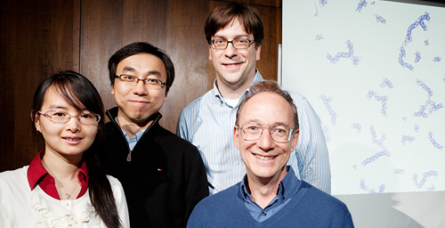| Researchers led by Founder Professor of Engineering Steve Granick, right, have developed tiny spheres that attract water to form "supermolecule" structures. Team members, from left, Qian Chen, doctoral student in materials science and engineering; Sung Chul Bae, research scientist; and Jonathan Whitmer, doctoral student in physics. Photo by L. Brian Stauffer |