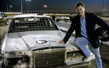 | New York Times technology reporter David Pogue travels the globe to examine the latest advancements in materials research and to find out what the future might hold. Here he examines the strength of steel. Credit: Courtesy of WGBH Boston |