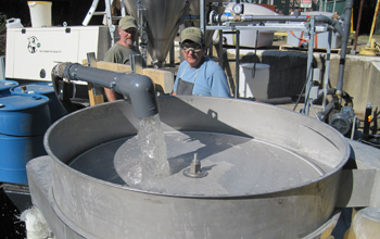 | Clean water being passed over a vibratory separator after treatment with Osorb®. Pictured are Dr. Stephen Jolly, ABSMaterials vice president for systems, and Doug Martin, ABSMaterials production manager. Credit: Sarah Pollock, ABSMaterials |