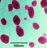| Transmission electron microscopy (TEM) image of an ultrabright fluorescent mesoporous silica nanoparticle (image colored artificially to match the actual color of the dye in the particles). |