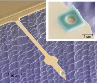 | This is a false-color image of a single-crystal Si cantilever and its attached annular SRO particle. Inset: Scanning electron microscope image of the SRO “ring” with a 0.7-ìm diameter hole. Credit: Raffi Budakian, University of Illinois |