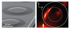 | On left, a scanning electron micrograph of Eaton lenses on a gold film. On right, fluorescence imaging shows the intensity of SPPs propagating in z-direction (arrow) and bending to the right when passing through an Eaton lens. The solid line marks the outer diameter of the lens and the dashed line marks the high index region. (Image by Zhang group) |