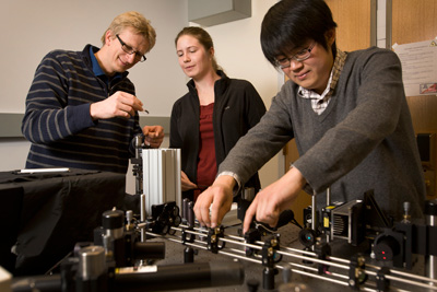 | Ulrich Wiesner, left, works with graduate students Jennifer Drewes and Kai Ma to characterize the size and brightness of C dots in their Bard Hall lab. Credit Jason Koski/University Photography |