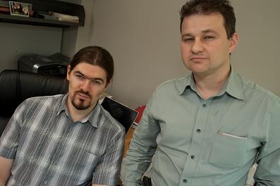 | Rice graduate student Alexey Akimov, left, and Anatoly Kolomeisky, associate professor of chemistry, have taken a large step toward defining the behavior of molecules attached to a gold surface. (Credit Jeff Fitlow/Rice University) |