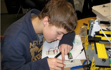 | Chassell High School student Jared Jarvi working on the wiring of a "bread board" for a light sensor array. Part of INANO's Lego model is shown. |